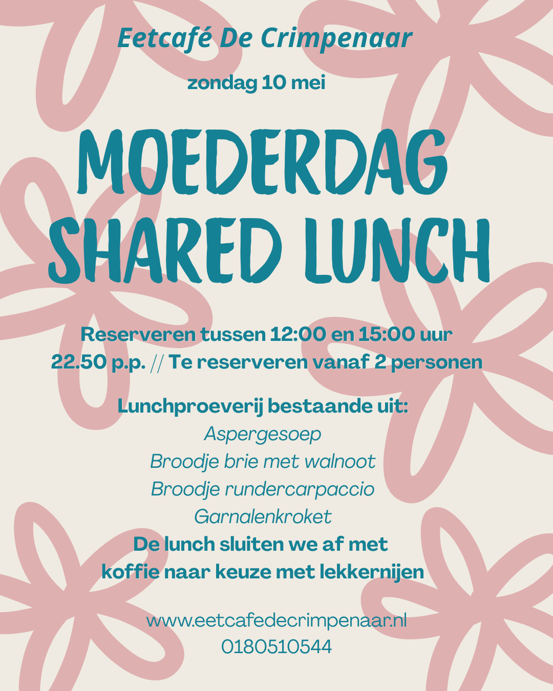 Verras je moeder deze Moederdag met een gezellige lunch bij Eetcafé De Crimpenaar. Op zondag 10 mei 2026 genieten jullie samen van een heerlijke Shared Lunch: een gevarieerde lunchproeverij om lekker te delen.